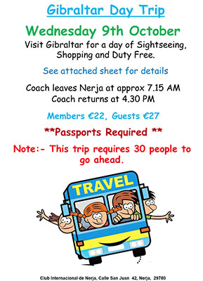 De terugkeer vanuit Gibraltar staat gepland om 16.30 uur. Het meebrengen van een paspoort is vereist. Opgave voor de trip is mogelijk bij de Club Internacional de Nerja aan de Calle San Juan 42 in Nerja.