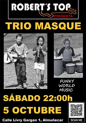 ALMUNECAR – Bij bar/restaurant Robert’s Top in Almuñécar staat zaterdagavond 5 oktober een optreden geprogrammeerd van het Trio Masque. Het optreden begint rond 22.00 uur en duurt circa twee uur.