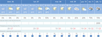 Vandaag (zondag 6 oktober) en maandag 7 oktober kan de gemiddelde dagtemperatuur nog oplopen tot respectievelijk 27 en 28 graden, voor de rest van de week zijn daggemiddelden van circa 24 graden Celsius voorzien. Daarbij wordt voor dinsdag 8 en woensdag 9 oktober tevens een vrij stevige wind verwacht, die halverwege de week afzwakt tot vrijwel nihil.