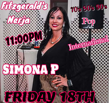 NERJA – De zangeres Simona Pittari treedt vijdagavond 18 oktober op bij Fitzgerald’s Bar II, in het centrum van Nerja aan de Calle Antonio Millón 2.