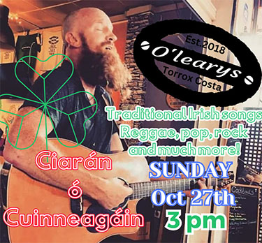TORROX – De Ierse zanger en gitarist Cíarán Ó´Cuínneagáin treedt zondagmiddag 27 oktober op bij O’Leary’s Irish Bar aan de Paseo Maritímo de Ferrara in de kustplaats Torrox.