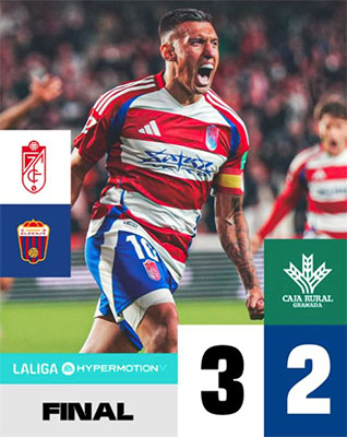 GRANADA – In het eigen stadion Nuevo Los Cármenes heeft voetbalclub Granada CF de Segunda División-competitiewedstrijd tegen CD Eldense winnend afgesloten. Het zag er zaterdagavond 9 november lange tijd naar uit dat de Andalusische formatie met een puntendeling genoegen zou moeten nemen, tot de veel scorende aanvaller Myrto Uzuni het pleit in het voordeel van de thuisclub beslechtte: 3-2.