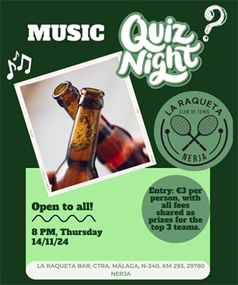 NERJA – In het restaurant van het tennis- en paddlepark La Raqueta aan de N-340 in Nerja (bovenaan de afslag naar Playa Burriana) staat donderdagavond 14 november een zogeheten quiz-night op het programma.