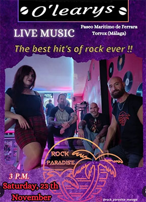 TORROX – De formatie Rock Paradise speelt zaterdagmiddag 23 november voor de eerste keer bij de Ierse pub O’Leary’s in Torrox. Het optreden begint rond de kok van 15.00 uur.