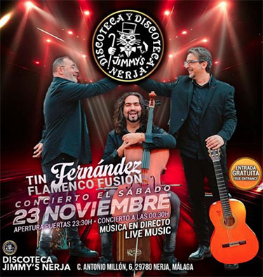Tin Fernández Flamenco Fusion bij discotheek Jimmy´s NERJA – De formatie Tin Fernández Flamenco Fusion treedt zaterdagavond 23 november op bij discotheek Jimmy´s aan de Calle Antonio Millón 6 in het centrum van Nerja. Het optreden begint rond de klok van 00.30 uur. Delen: Klik om te delen op X (Opent in een nieuw venster) X Klik om te delen op Facebook (Opent in een nieuw venster) Facebook Vind-ik-leuk Aan het laden...