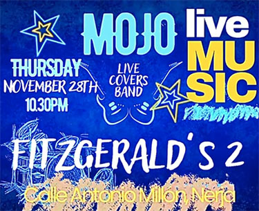 Coverband Mojo bij Fitzgerald’s Bar II in Nerja NERJA – De coverband Mojo treedt donderdagavond 28 november op bij Fitzgerald’s Bar II aan de Calle Antonio Millón 2 in het centrum van Nerja. Het optreden is gratis toegankelijk en begint rond 22.30 uur. Delen: Klik om te delen op X (Opent in een nieuw venster) X Klik om te delen op Facebook (Opent in een nieuw venster) Facebook Vind-ik-leuk Aan het laden...