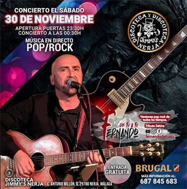 Gitarist Fernando bij discotheek Jimmy´s in Nerja NERJA – De gitarist Fernando treedt zaterdagavond 30 november op bij discotheek Jimmy´s aan de Calle Antonio Millón 6 in het centrum van Nerja. Het optreden begint rond de klok van 00.30 uur. Fernando brengt daarbij pop- en rockmuziek ten gehore. Delen: Delen op X (Opent in een nieuw venster) X Share op Facebook (Opent in een nieuw venster) Facebook Vind-ik-leuk Aan het laden...