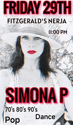NERJA – De zangeres Simona Pittari treedt vrijdagavond 29 november op bij Fitzgerald’s Bar II, in het centrum van Nerja aan de Calle Antonio Millón 2.