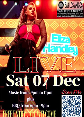 TORROX – In bar Los Amigos in de kustplaats Torrox treedt zaterdagmiddag 7 december de zangeres Eliza Handley op. Het optreden begint rond 21.00 uur en duurt tot circa 23.00 uur.