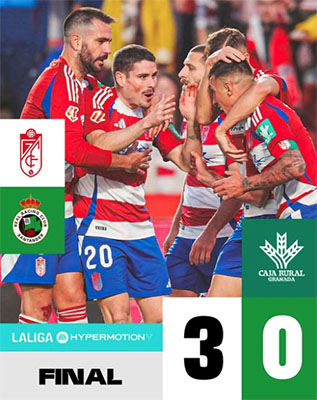 GRANADA – In het Nuevo Los Cármenas-voetbalstadion van Granada CF boekte een uiterst effectief voetballend Granada CF zaterdagmiddag 7 december een ruime 3-0 overwinning in de Spaanse Segunda Divisón op koploper Racing de Santander.