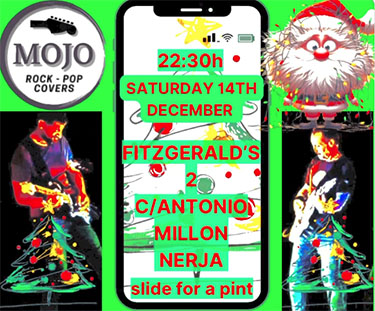 Coverband Mojo speelt bij Fitzgerald’s Bar II NERJA – De coverband Mojo treedt zaterdagavond 14 december op bij Fitzgerald’s Bar II aan de Calle Antonio Millón 2 in het centrum van Nerja. Het optreden is gratis toegankelijk en begint rond 22.30 uur. Delen: Klik om te delen op X (Opent in een nieuw venster) X Klik om te delen op Facebook (Opent in een nieuw venster) Facebook Vind-ik-leuk Aan het laden...
