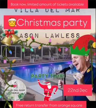 MARO – De zanger Jason Lawless treedt zondagmiddag 22 december op bij camping Villa del Mar in Maro (aan de kust naast Nerja gelegen) tijdens een zogeheten Christmas Party. Het optreden is vrij toegankelijk, de show begint rond de klok van 13.00 uur en duurt tot circa 16.00 uur.