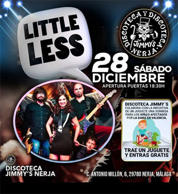 NERJA – In de discotheek Jimmy´s, in het centrum van Nerja, treedt zaterdagavond/nacht 28 december de band Little Less op. Het optreden is gratis toegankelijk, duurt circa drie uur en begint om 00.30 uur.