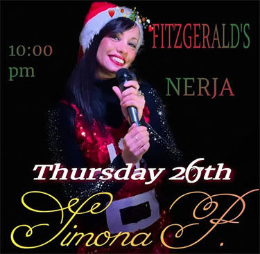 NERJA – De zangeres Simona Pittari treedt donderdagavond 26 december op bij Fitzgerald’s Bar II, in het centrum van Nerja aan de Calle Antonio Millón 2.