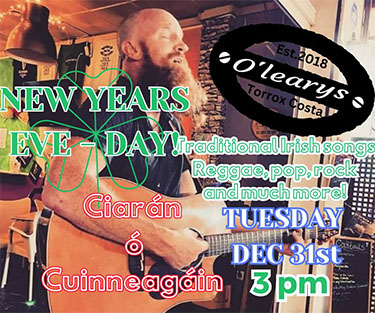 TORROX – De Ierse zanger en gitarist Cíarán Ó´Cuínneagáin treedt dinsdagmiddag 31 december op bij O’Leary’s Irish Bar aan de Paseo Maritímo de Ferrara in de kustplaats Torrox.