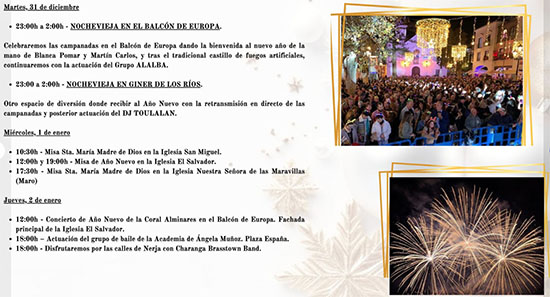 Het bekijken van de gemeentelijke vuurwerkshow vanaf het Balcón de Europa is een unieke ervaring met het imposante kleuren- en lichtspel boven het water van de Middellandse Zee en kustlijn van Nerja. Het feest begint op maandag 31 december rond 23.00 uur, waarbij de band AlAlba optreedt, en eindigt om circa 02.00 uur.