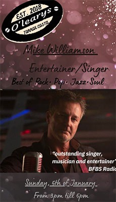 TORROX – De zanger en gitarist Mike Williamson speelt zondagmiddag 5 januari bij de Ierse pub O’Leary’s in Torrox. Het optreden begint rond de klok van 15.00 uur en duurt circa twee uur.