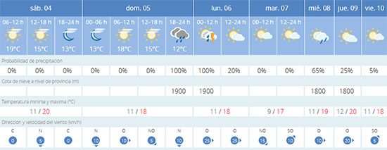 In de nacht van zondag 5 op maandag 6 januari is er bovendien een grote kans op onweer boven Nerja en omstreken. Voor de komende week verwacht Aemet redelijk veel bewolking, een lichte regenkans op woensdag 8 januari en gemiddelde dagtemperaturen die tegen de grens van twintig graden Celsius aanhikken. De wind zwelt in de nacht van zondag op maandag aan, om vervolgens de gehele week prominent aanwezig te zijn aan de kust rond Nerja.