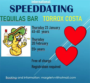TORROX-COSTA – Bij Tequilas Bar aan de Calle Estepona in de kustplaats Torrox-Costa (op amper tien kilometer van Nerja gelegen, red.) staat donderdagavond 23 januari een speeddating-avond op het programma. De avond staat open voor mannen en vrouwen in de leeftijdscategorie 45-60 jaar.
