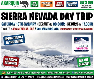 NERJA – Wintersportliefhebbers die momenteel aan de Costa del Sol in of rond Nerja vertoeven, kunnen volgende week hun hart ophalen. De Axarquía Social Club heeft namelijk voor zaterdag 18 januari een ééndaagse bustrip uitgezet naar het ski- en wintersportoord Sierra Nevada, op iets meer dan een uur rijden van de kustplaats Nerja.