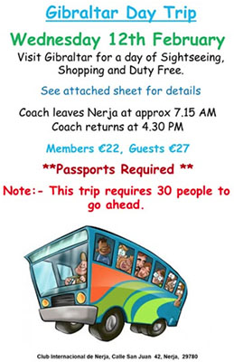 NERJA – Vanuit Nerja is voor woensdag 12 februari door de Club Internacional de Nerja een dagtrip per bus uitgezet naar Gibraltar. De deelnamekosten bedragen 27 euro per persoon (clubleden betalen 22 euro), vertrokken wordt er per bus om 07.15 uur vanuit Nerja.