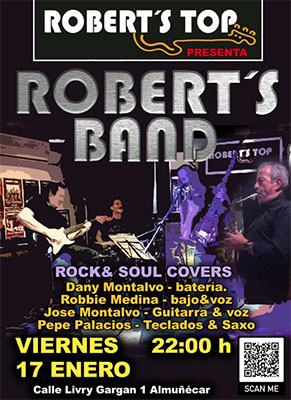 ALMUNECAR – In bar/restaurant Robert’s Top in Almuñécar staat vrijdagavond 17 januari een optreden geprogrammeerd van Robert´s Band. Het optreden begint rond 22.00 uur.