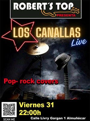 Dit gebeurt vanaf 22.00 uur. De bar is gevestigd aan de Calle Livry Gargan 1 in de kustplaats Almuñécar, een kleine twintig kilometer boven Nerja. Los Canallas brengt voornamelijk pop en rock-covers ten gehore.
