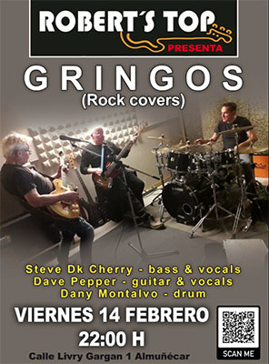 ALMUNECAR – Bij bar/restaurant Robert’s Top in Almuñécar staat vrijdagavond 14 februari een optreden geprogrammeerd van de band The Gringos. Het optreden begint rond 22.00 uur.