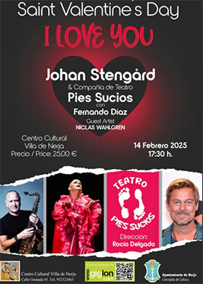 NERJA – In het Centro Cultural Villa de Nerja wordt vrijdagavond 14 februari (Valentijnsdag) de mucical ´I Love You´ van Johan Stengård opgevoerd. De show in het cultureel centrum aan de Calle Granada 45 in de binnenstad van Nerja duurt een kleine anderhalf uur en begint om 17.30 uur.