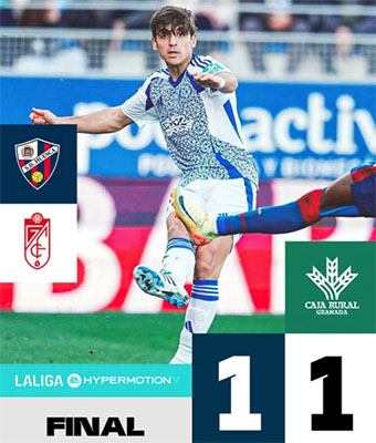 In het El Alcoraz-stadion van Huesca begon Granada voortvarend aan het treffen met de nummer drie van de Segunda División. Na de veldverwijzing van Sánchez was het evenwel gedaan met het veldoverwicht van de bezoekers, die halverwege de tweede helft een tegentreffer (1-0) moesten incasseren van de Kameroener Serge Patrick. Zes minuten voor tijd redde de Argentijn Lucas Boyé alsnog de meubelen voor Granada CF: 1-1.