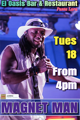 PUNTA LARA – Bij Bar Oasis in Punta Lara, een dorp aan de kust nèt buiten Nerja richting Torrox, treedt dinsdagmiddag 18 februari ‘The reggae rock star Magnet Man’ op.