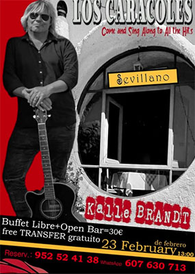 TORROX – Bij restaurante Los Caracoles del Sevillano aan de M-105 tussen Torrox en Frigiliana staat zondagmiddag 23 februari een optreden geprogrammeerd van de gitarist Kalle Brandt. De middag begint rond de klok van 13.00 uur.