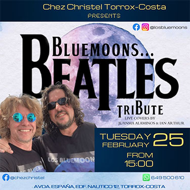 TORROX-COSTA – In bar Chez Christel in de kustplaats Torrox, op zo’n tien kilometer afstand van Nerja, staat dinsdagmiddag 25 februari een optreden gepland van de band Los BlueMoons met een Beatles-tribute.