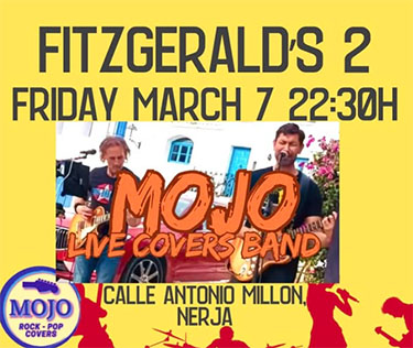NERJA – De coverband Mojo speelt vrijdagavond 7 maart bij Fitzgerald’s Bar II aan de Calle Antonio Millón 2 in het centrum van Nerja.