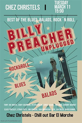 Het optreden is verplaatst naar dinsdagmiddag 18 maart, met als aanvangstijdstip 15.00 uur. Preacher brengt vooral nummers van onder anderen Eric Clapton, Johnny Cash, Lou Reed en Elvis Presley ten gehore in een mix aan blues- en rockmuziek. Het optreden van ‘the one man band’ Billy Preacher bij Chez Christel is gratis toegankelijk.