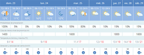 Wel blijft het veelal bewolkt de komende dagen, veel regen zal daaruit niet neerdalen op Nerja. Ook de wind laat het vrijwel de gehele week afweten. Wél bestaat er nog kans op een lokale onweersbui op dinsdagavond. Qua temperaturen treedt ook er een lichte verbetering op: volgens de meteorologen ligt de gemiddelde dagtemperatuur de komende week nèt onder de twintig graden Celsius.