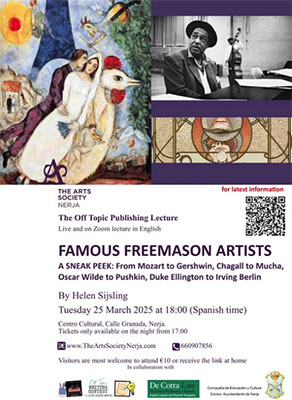 NERJA – Bij de Arts Society Nerja kan dinsdagavond 25 maart een Engelstalige lezing worden bijgewoond. Deze wordt verzorgd door Helen Sijsling heeft als titel ‘Famous Freemason Artists´.