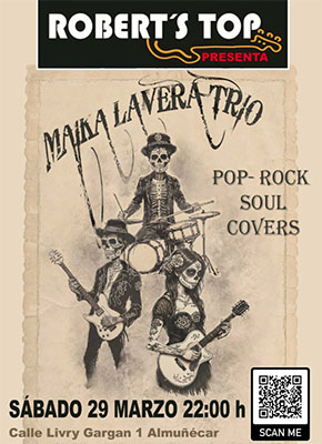 ALMUNECAR – Het regionaal befaamde Maika Lavera Trio speelt zaterdagavond 29 maart bij bar Robert´s Top in de kustplaats Almuñécar, een kleine twintig kilometer boven Nerja gelegen. Het optreden begint rond de klok van 22.00 uur.
