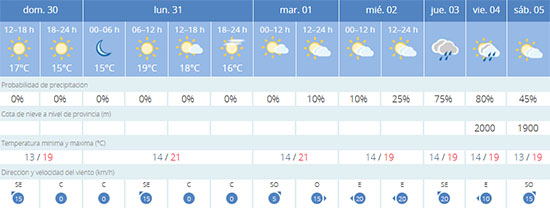 NERJA – De meteorologen van het weerstation Aemet (Agencia Estatal de Meteorología) verwachten de komende week redelijk veel zon en gemiddelde dagtemperaturen rond de 20 graden Celsius in en rond Nerja. Daarmee lijkt nu definitief een einde te komen aan de relatief lange periode van regenbuien en onbestendig weer.