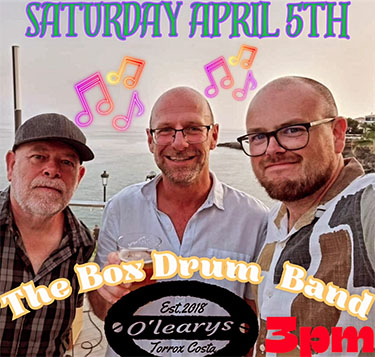 TORROX – The Box Drum Band (met onder anderen de in de Axarquía-regio populaire zanger en gitarist Lee Townsend in de gelederen, red.) treedt zaterdagmiddag 5 april op in de kustplaats Torrox, op circa tien kilometer van Nerja gelegen.