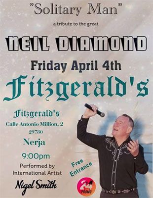NERJA – Bij Fitzgerald’s Bar II, aan de Calle Antonio Millón 2 in het centrum van Nerja, is vrijdagavond 4 april een Neil Diamond Tribute. De uitvoerende artiest daarbij is Nigel Smith.