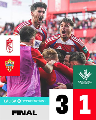 GRANADA – Via een sterk laatste kwartier van de wedstrijd heeft Granada CF zaterdagavond 5 april aan de Andalusische voetbalderby in de Spaanse Segunda División tegen UD Almería drie punten overgehouden. De thuisclub scoorde in die fase twee keer en bepaalde daarmee de eindstand op 3-1.