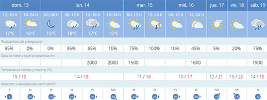 Vanaf woensdag 16 april lijkt het in de huidige vooruitzichten tot het volgende weekeinde droog te blijven maar is er wel sprake van regelmatig voorbijdrijvende wolkendekken. Ook blijven de temperaturen de komende dagen aan de lage kant voor de Costa del Sol met gemiddelde dagwaarden rond de 20 graden Celsius of iets daaronder. De wind gaat aan het einde van de week weer liggen, voor het volgend weekeinde bestaat er echter weer een grote regenkans.