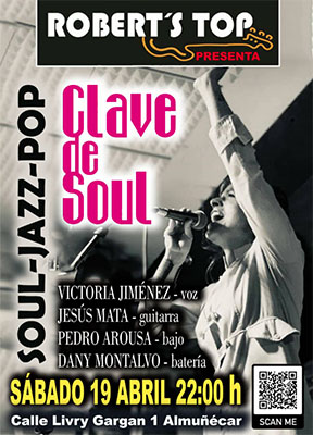 ALMUNECAR – Bij bar/restaurant Robert’s Top in Almuñécar treedt zaterdagavond 19 april de formatie Clave De Soul op. Deze band vervangt het aanvankelijk aangekondigde optreden van de formatie Las Canallas. Clave De Soul begint rond 22.00 uur.