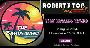 ALMUNECAR – Bij bar/restaurant Robert’s Top in Almuñécar staat vrijdagavond 25 april een optreden geprogrammeerd van de Bahía Band. Het optreden begint rond 22.00 uur.