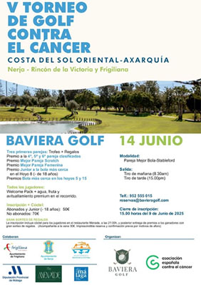 VELEZ-MALAGA – Op de terreinen van de Baviera Golf-club bij Vélez-Málaga staat zaterdag 14 juni de vijfde editie van het Torneo de Golf contra el cancer op de rol. Het toernooi begint om 08.30 uur in de ochtend en duurt tot circa 15.00 uur in de middag.