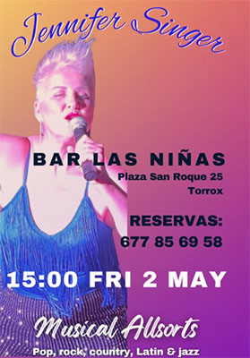 TORROX – De zangeres Jennifer Singer treedt vrijdagmiddag 2 mei op bij Bar Las Niñas in Torrox. Het optreden begint rond de klok van 15.00 uur.