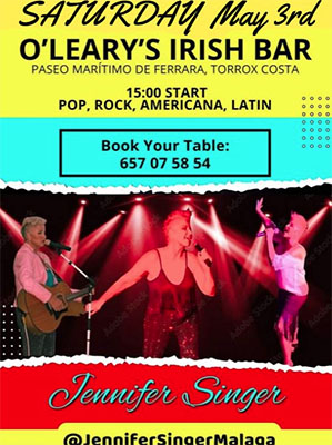 TORROX – De zangeres Jennifer Singer treedt zaterdag 3 mei op bij de Ierse pub O’Leary’s in Torrox. Het optreden begint rond de klok van 15.00 uur.