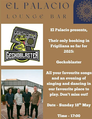 FRIGILIANA – In het bergdorp Frigiliana, op circa zeven kilometer landinwaarts van Nerja, treedt zondagavond 18 mei de band Geckoblaster op. Dit gebeurt bij loungebar El Palacio aan het Plaza de Las Tres Culturas 28 in Frigiliana.