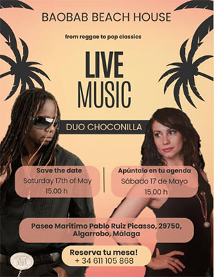 Duo Choconilla bij Baobab Beach House in Algarrobo TORROX – Bij Baobab Beach House in Algarrobo treedt zaterdagmiddag 17 mei het Duo Choconilla op. Het optreden begint om circa 15.00 uur. De bar is te vinden aan de Paseo Maritímo Pablo Ruiz Picasso 3 in de kustplaats. Delen: Klik om te delen op X (Opent in een nieuw venster) X Klik om te delen op Facebook (Opent in een nieuw venster) Facebook Vind-ik-leuk Aan het laden...